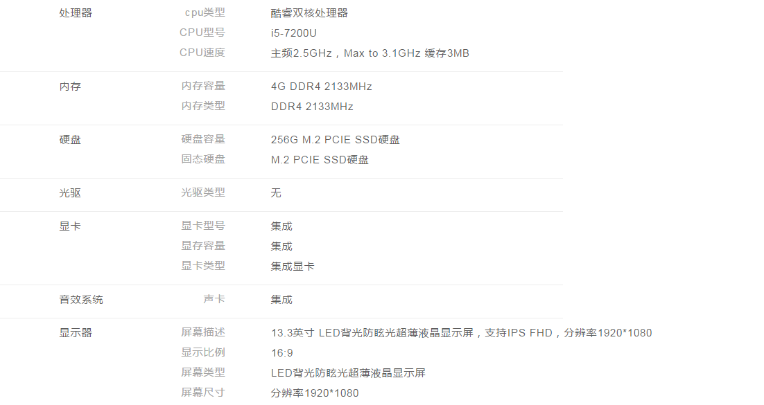 13.3英寸FHD/i5-7200U/4G/256G SSD/集显/win10 h/三年保
